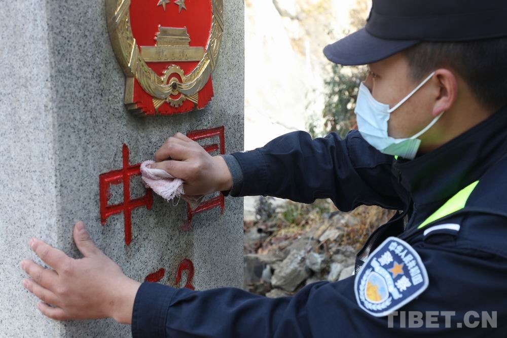 圖為執勤點民警為神圣的界碑描紅 攝影:鄒興國
