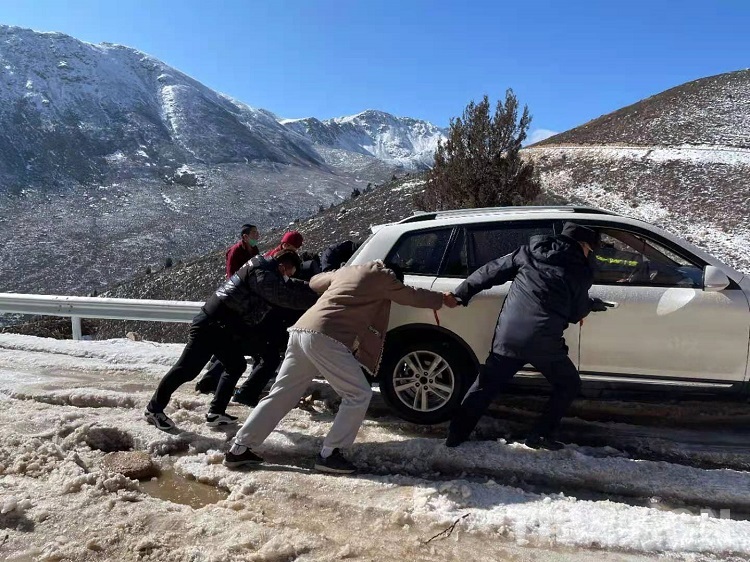 面對焦急萬分的父親,為了讓病中的孩子第一時間得到醫治,根秋降澤立即下車施救。由于鄉村道路路況較差,加之冰雪覆蓋,車輛打滑嚴重,施救過程十分艱難。根秋降澤憑借多年應對冰雪路況的駕駛經驗,組織大家在極度嚴寒、工具缺乏的情況下,通過刨冰除雪、手推車拉的方式,經過半個多小時的努力終于讓被困車輛擺脫困境。根秋降澤捂著凍僵的手,一再提醒駕駛員要常備防滑鏈條,在冰雪路段需小心謹慎駕駛,切勿急打方向等注意事項。