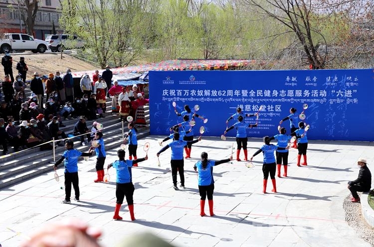 中國西藏網訊 3月27日,為慶祝西藏百萬農奴解放62周年,進一步貫徹落實全民健身國家戰略,由西藏自治區體育局、西藏自治區體育總會、慈松塘社區黨支部主辦的慶祝百萬農奴解放62周年暨全民健身志愿服務“六進”活動走進慈松塘社區。