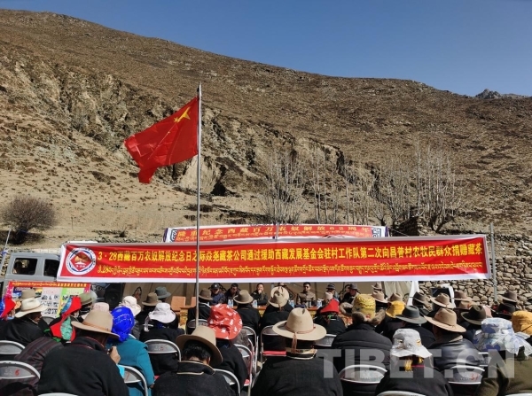 援助西藏發展基金會駐多角鄉昌普村工作隊與雅安相關藏茶公司向昌木普村每位村民獻上哈達并捐贈60份優質藏茶,表達對全體村民深情祝福。
