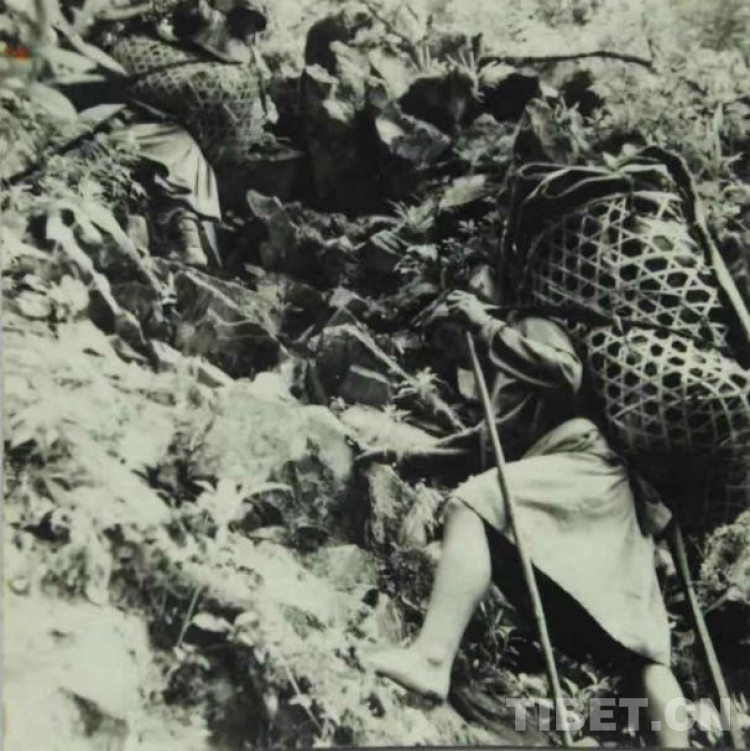 舊西藏,墨脫群眾赤腳徒步爬山背運物資的情景