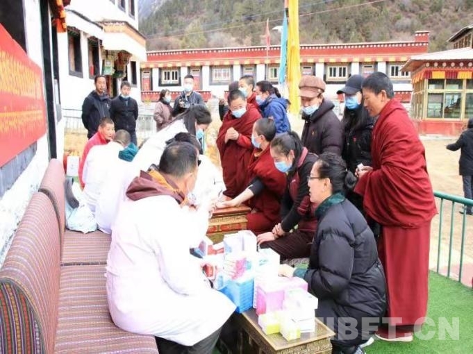 在古覺拉康,醫務人員為寺廟僧尼測血壓、診脈、健康咨詢、健康知識宣講,免費發放常用西藥、藏藥20余種及糖尿病、高血壓、肺結核等慢性疾病與新冠肺炎疫情防控宣傳資料;細致講解常見病、多發病的預防知識;針對不同病癥和個體差異提出合理的診療建議和治療方案。同時,還為僧尼發放了毛巾、牙膏、洗潔精等衛生用品。