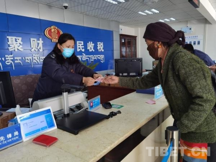 圖為國家稅務總局薩迦縣稅務局辦稅服務廳里稅務人員在為群眾辦理業務
