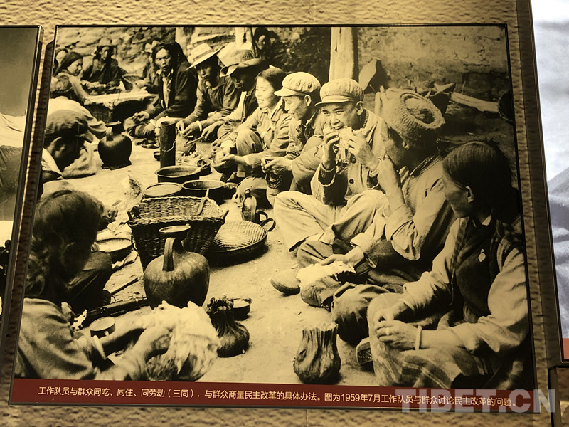 圖為西藏民主改革時工作隊員與群眾同吃、同住、同勞動。圖片源自拉薩烈士紀(jì)念館