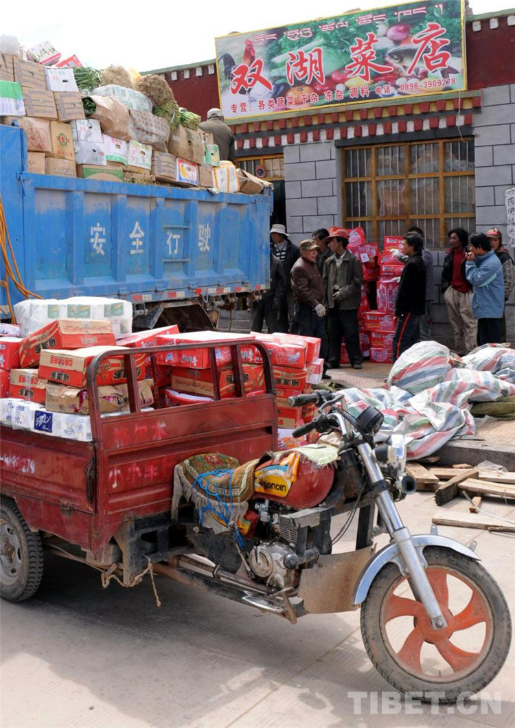 這是雙湖特別區(現為雙湖縣)的“雙湖菜店”正在準備把包車運來的蔬菜等物品卸貨(唐召明2009年8月攝)