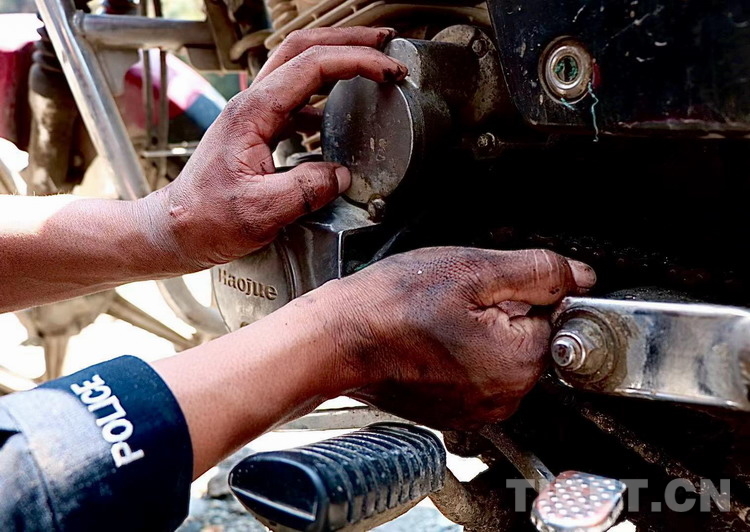 如果你經(jīng)過日喀則邊境管理支隊陳塘邊境派出所頓樟執(zhí)勤點,你有可能會在執(zhí)勤點旁邊的空地上看見一位不停揮舞著扳手,雙手沾滿機(jī)油的民警正圍著摩托車忙碌著。他叫王昱隆,是陳塘邊境派出所的一名民警,年初被分配到頓樟執(zhí)勤點,到現(xiàn)在他已經(jīng)義務(wù)幫助不少地過往行人維修摩托車了。