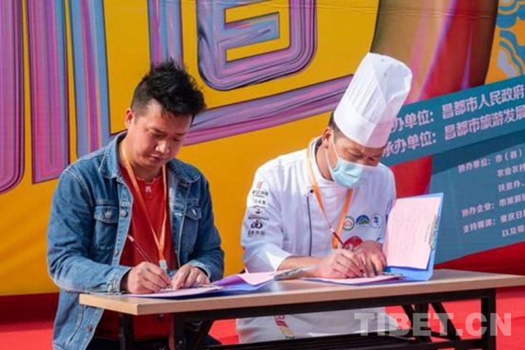 此外,活動現場還進行了非物質文化遺產體驗活動和產品展銷活動,共有32個企業參加。據悉,截止活動結束,現場累計交易額5萬余元。重慶文旅館同參賽人員進行現場簽約,這對昌都餐飲業的推廣和發展具有重要的意義。(中國西藏網 記者/次旦拉姆 圖片由卓卓康巴美食大賽組委會提供)