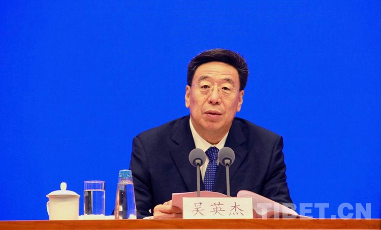 圖為中共西藏自治區委員會書記吳英杰在發布會上介紹西藏發展情況 攝影:劉莉