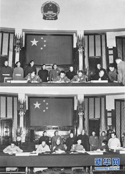 圖為1951年5月23日,中華人民共和國中央人民政府全權代表(上圖)和西藏地方政府全權代表(下圖)在《中央人民政府和西藏地方政府關于和平解放西藏辦法的協議》上簽字。上圖坐者右起為中央政府全權代表:李維漢、張經武、張國華、孫志遠。下圖坐者右起為西藏地方政府全權代表:阿沛?阿旺晉美、凱墨?索安旺堆、土丹旦達、土登列門、桑頗?登增頓珠。