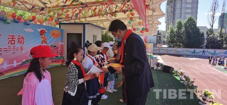 圖為西藏自治區(qū)拉薩市城關(guān)區(qū)納金小學(xué)“童心向黨、做時代新人”六一兒童節(jié)活動現(xiàn)場為優(yōu)秀學(xué)生頒獎