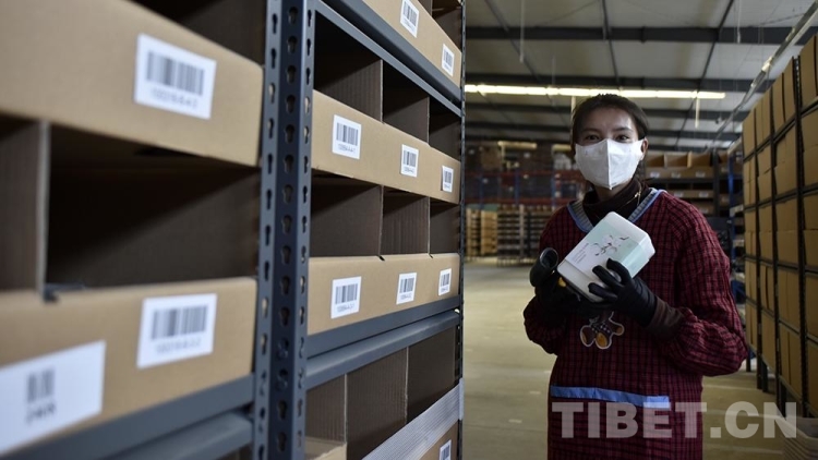 圖為西藏自治區級公共物流倉儲配送中心里,作業人員將搬運型機器人“地狼”載來的貨架上的貨物取出