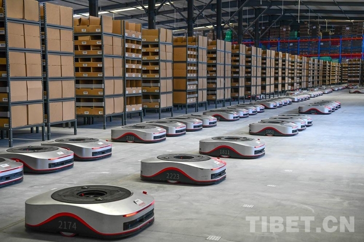 圖為西藏自治區級公共物流倉儲配送中心里,搬運型機器人“地狼”正在工作