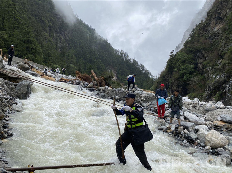 在經過勘察后,派出所民警發現左布德至國防公路四號橋位置發生大面積山體滑坡10余處,救援隊研判搜救風險后,通過搭橋、吊繩、分批護送等方式打通了長達10公里的“生命通道”。