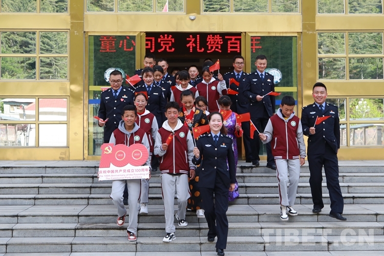 圖為西藏亞東出入境邊防檢查站與駐地學(xué)生開展“童心向黨 禮贊百年”系列活動