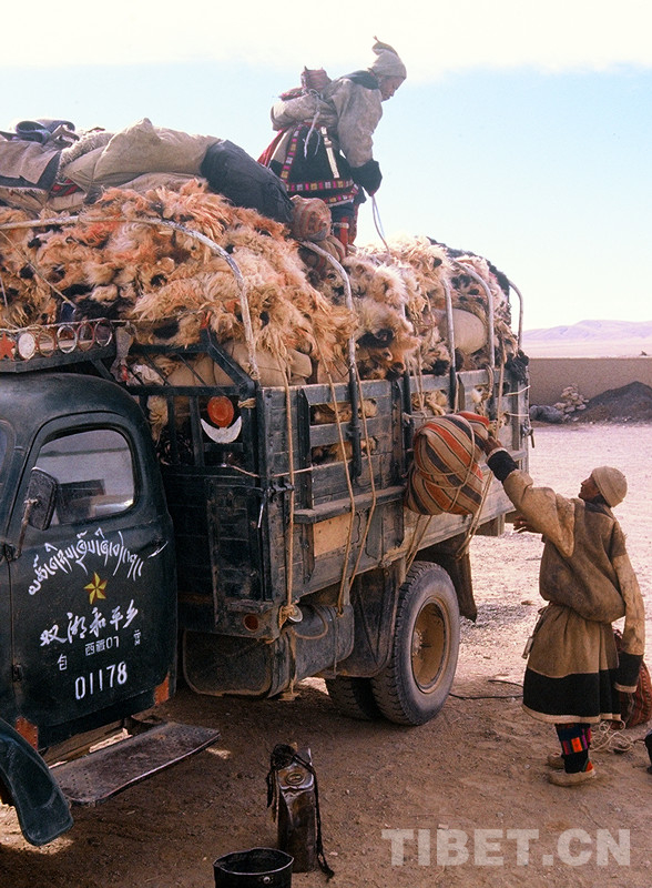 這是藏北雙湖辦事處(現(xiàn)雙湖縣)和平鄉(xiāng)牧民正在裝車外運交售的畜產(chǎn)品(唐召明1987年攝)