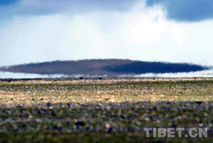 圖為出現在藏北無人區的形似飛碟的海市蜃樓。海市蜃樓是因空氣中不斷升騰的水汽將光線折射而形成(唐召明2009年8月2日攝)