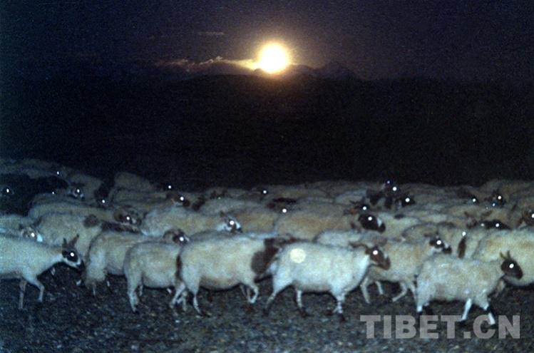 圖為夜幕下牧歸的羊群。它們的眼睛在夜里所發出的光,猶如“草原燈火”(唐召明1988年攝)