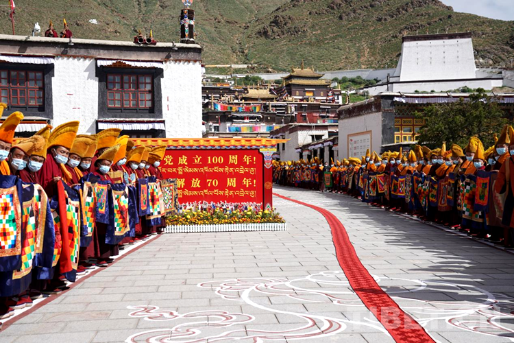 當日上午,扎什倫布寺前廣場上,信教群眾早早在此等候;通往扎什倫布寺的道路兩旁,手持法器的僧眾以藏傳佛教最高禮儀迎接班禪。