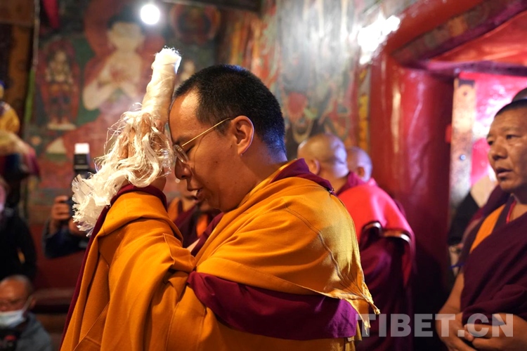 當日下午,班禪登上拉讓日光殿寶座,接受扎什倫布寺管委會僧人成員、高僧的朝拜,為他們摸頂賜福,并帶領高僧集體誦經(jīng)祈禱。