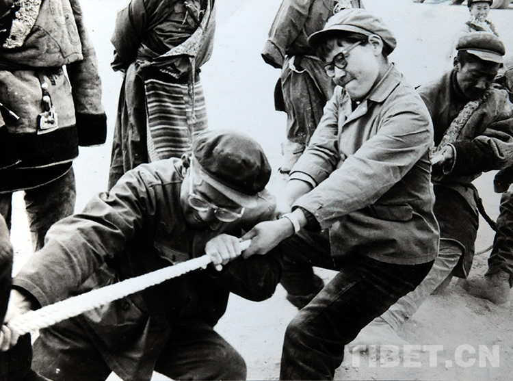 1976年盛夏,雙湖辦事處(現雙湖縣)副書記次仁玉珍(中)在進行拔河比賽。這是西藏開發藏北無人區后,雙湖辦事處為拓荒者首次舉辦的體育活動(唐召明翻拍資料圖片)