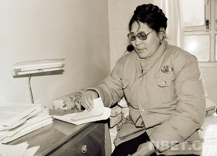 1987年,時任那曲地區(現那曲市)行署副專員的次仁玉珍在拉薩參加西藏“兩會”時,在駐地房間準備上會提案(唐召明1987年攝)