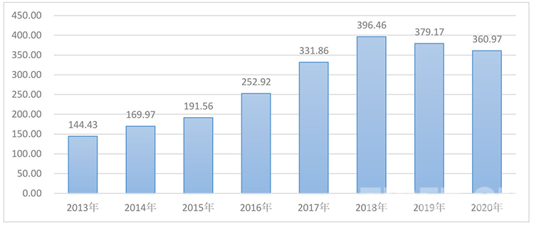 圖為 2013—2020年西藏稅收收入規模(億元)