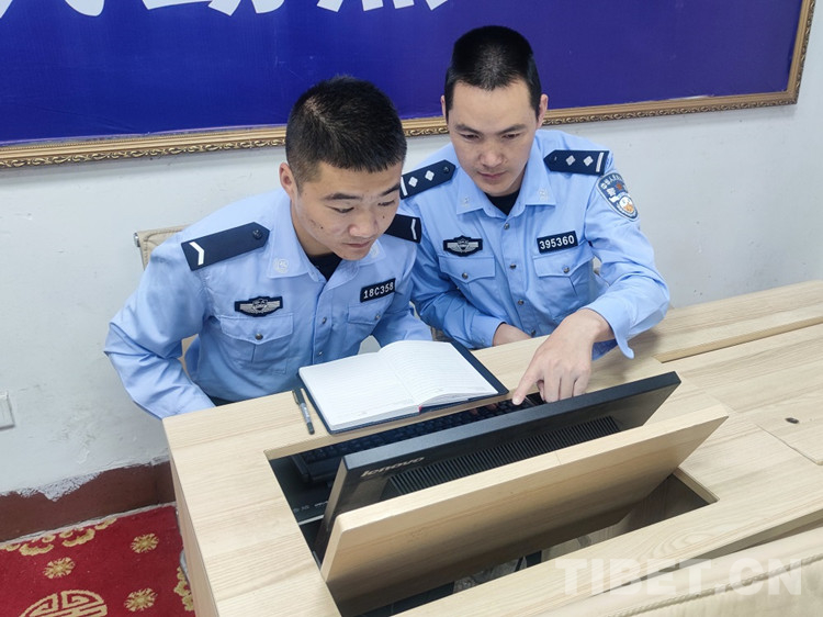 圖為劉華強(右)正在指導新警李東洪進行邊檢業務學習 攝影:尼瑪云丹