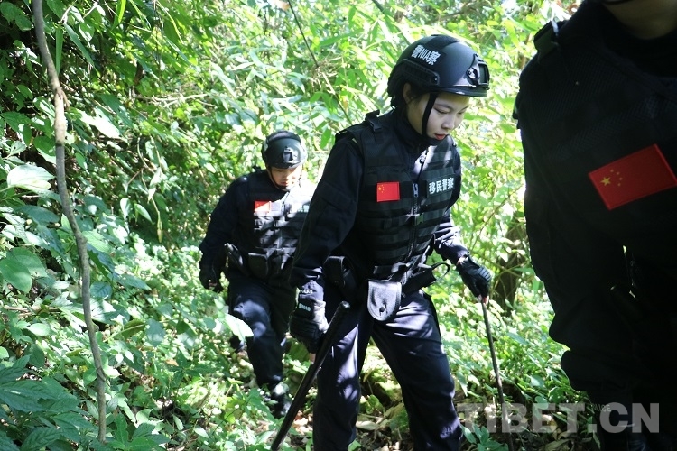走在隊伍最前面的是經驗豐富的老民警李永杰,他手里拿著一把砍刀,一邊清理小路兩側蔓延出來的枝椏,一邊時刻注意著兩位女民警情況。隨著海拔升高,走進樹木茂盛的叢林,陽光只能從郁郁蔥蔥的樹葉間撒下兩三縷光芒,兩名女民警瞪大眼睛好奇地觀察著周圍,對接下來的行程充滿期待。