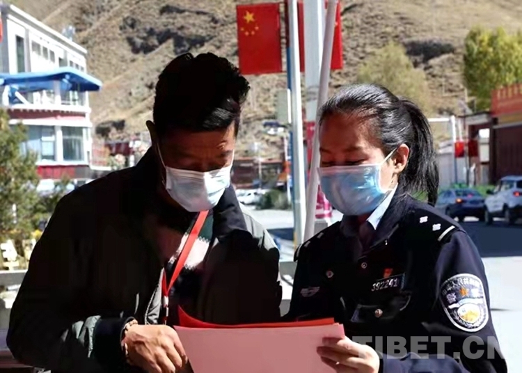 “出家門,戴口罩,少聚會,少串門,非常時期要留神。勤洗手,講衛生,室內開窗多通風。舊口罩,要收起,有害垃圾要處理……”民警珠央正在使用漢藏雙語向駐地群眾宣講防疫口訣。