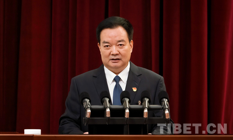 圖為西藏自治區黨委書記王君正代表中國共產黨西藏自治區第九屆委員會向大會作報告 攝影:趙耀