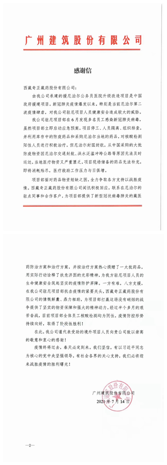 患者經多次核酸檢測轉陰未復陽后,廣州建筑集團特地給西藏奇正藏藥股份有限公司寫了一份感謝信,信中寫到:西藏奇正藏藥股份有限公司為項目部提供了新型冠狀病毒肺炎的藏醫藥防治方案和治療方案,并按治療方案熱心捐贈了一大批藥品,用實際行動詮釋了扶危濟困的光彩精神,為我方駐尼項目人員的生命健康安全筑起堅實的疫情防護屏障。一方有難,八方支援,在我公司駐尼項目部抗擊疫情的緊要關頭,西藏奇正藏藥股份有限公司的慷慨解囊、鼎力相助,為項目部打贏這場沒有硝煙的戰爭提供了堅實的物資保障和強大的精神動力。