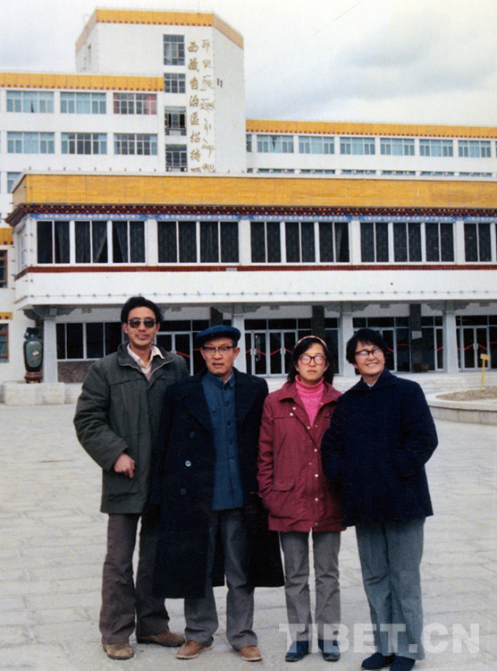 這是唐召明(左一)與孫光明(左二)一家在拉薩西藏自治區招待所樓前合影留念(旺堆1990年攝)
