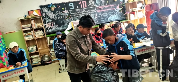圖為薩迦縣中學理發社學生在老師指導下給其他學生剪頭發