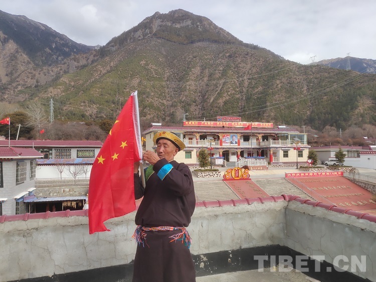 圖為公覺旦巴在村口為村民們發(fā)放新國(guó)旗