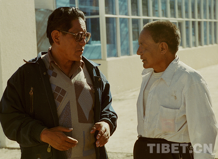 這是原雙湖辦事處首任書記,后任那曲地委(現(xiàn)那曲市)書記、西藏人大常委會(huì)副主任等職的洛桑丹珍(左)在申扎縣調(diào)研時(shí)與當(dāng)?shù)乩细刹窟M(jìn)行交流(唐召明2001年攝)