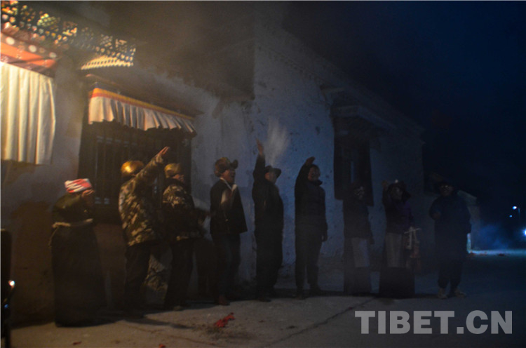 查斯一家與鄰居一起拋灑糌粑、祈福 攝影:歐帆