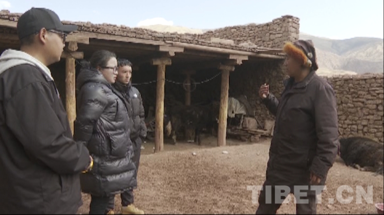 圖為貢覺縣畜牧站工作人員給村民索朗桑布指導飼養保暖措施