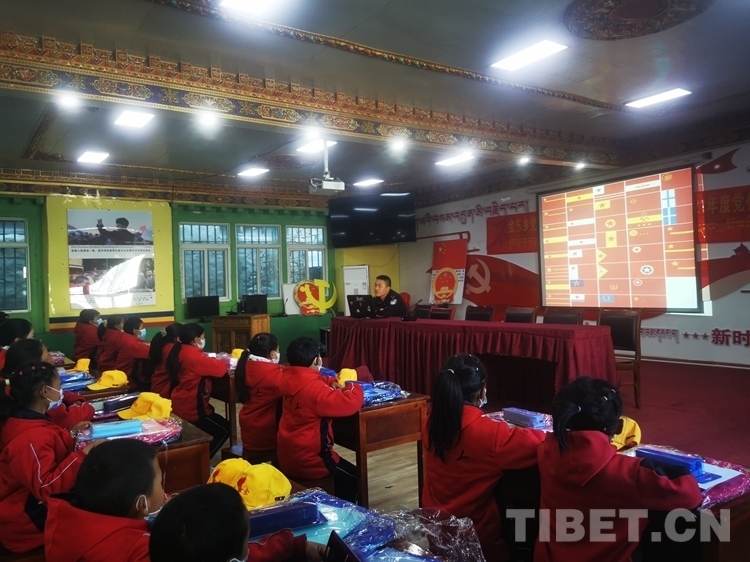 圖為西藏林芝金東邊境派出所民警在朗縣國門講習所為當地小學生們帶來愛國主義小課堂 攝影:徐華升