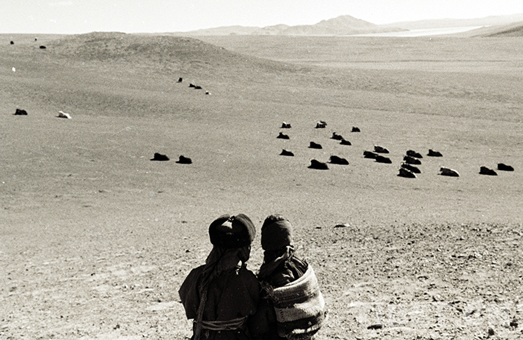 這是雙湖辦事處(現雙湖縣)嘎措鄉二村的兩名兒童正在觀看放牧的牦牛群(唐召明1988年攝)
