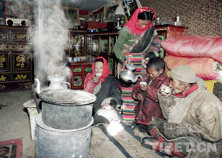 這是雙湖辦事處(現雙湖縣)嘎措鄉一村老牧人達加一家,正在新居里喝酥油茶(唐召明1988年攝)