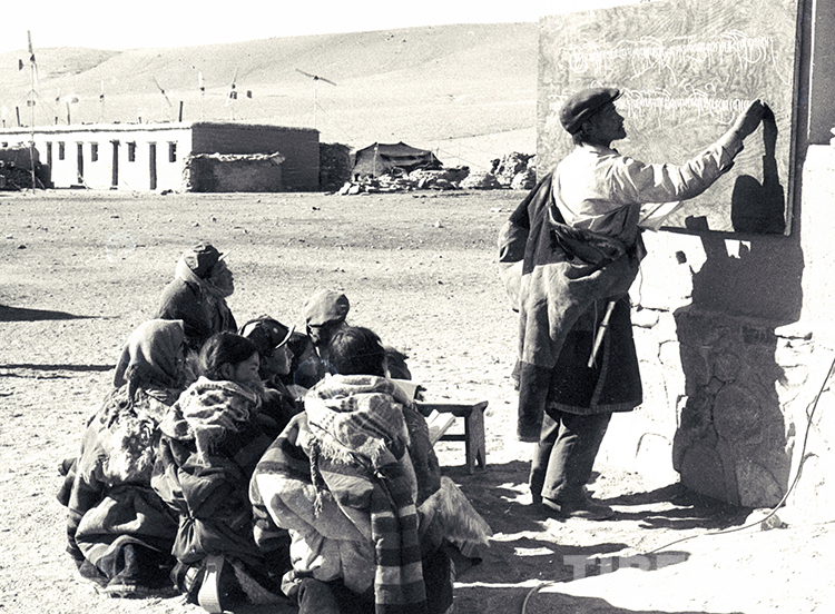 這是雙湖辦事處(現雙湖縣)嘎措鄉一村教師巴多在給孩子們上藏文課。巴多是村里唯一的教師,也是村里供銷社唯一的營業員(唐召明1988年攝)