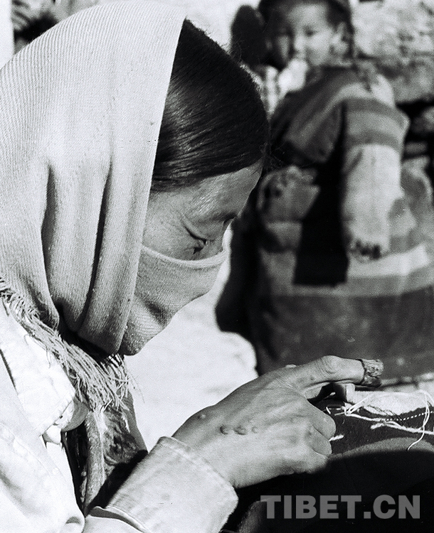 這是雙湖辦事處(現雙湖縣)嘎措鄉一村的一位牧女在為女兒縫制藏袍(唐召明1988年攝)