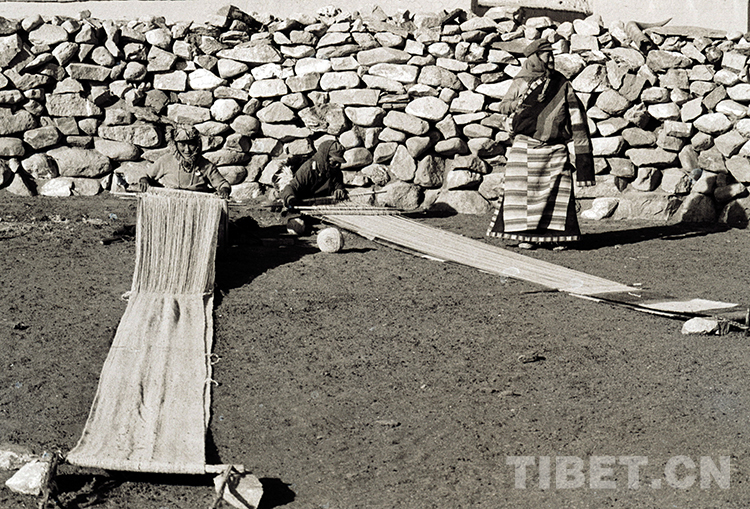 這是雙湖辦事處(現雙湖縣)嘎措鄉一村牧女坐在石砌大羊圈的干羊糞層上織氆氌(唐召明1988年攝)