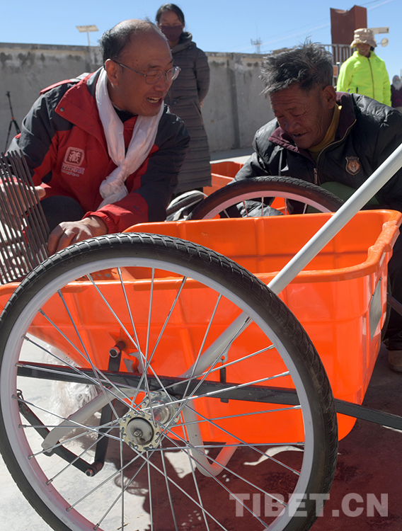 這是唐召明(左)在雙湖縣嘎措鄉一村指導他30多年前的房東、藏族牧民朋友日瑪(右)安裝北京建藏援藏工作者協會贈送的高原撿拾車(楊月云2019年9月20日攝)