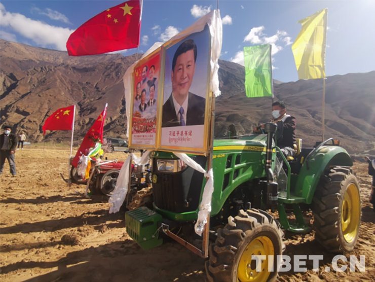 活動現場,群眾頭戴藏式金花帽,身著氆氌藏裝,或手持犁耙和鋤頭,或開著拖拉機,以吃切瑪、敬青稞酒、獻哈達、跳鍋莊、犁地、播種等傳統習俗,隆重慶祝共康村首屆開耕節。