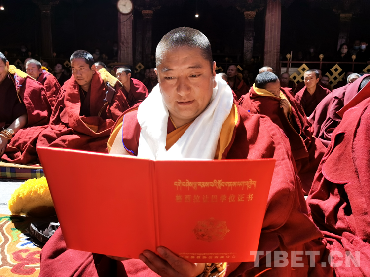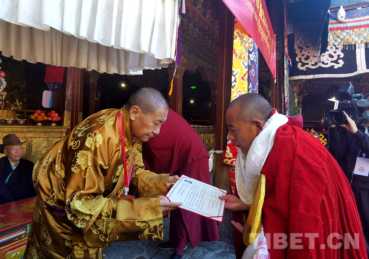 活動現場,西藏自治區人民政府副秘書長馬立柱代表西藏自治區人民政府向獲得學位的考僧贈送五彩緞、干果、袈裟和禮金;西藏自治區宗教局副局長達娃窮達向參加答辯活動的僧人發放布施;中國佛教協會西藏分會常務副會長、西藏佛學院院長珠康?土登克珠致賀詞,并代表班禪額爾德尼?確吉杰布會長向獲得學位的考僧獻哈達、頒發學位證書。