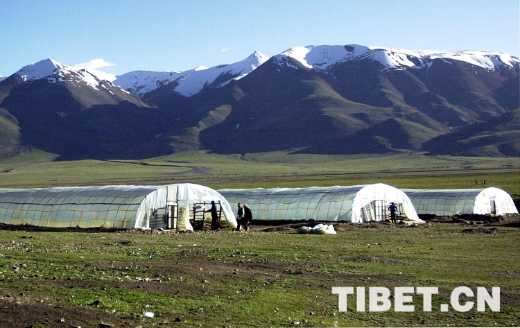 這是四川農(nóng)民胡少南投資20多萬元所建成的蔬菜大棚。它建在申扎縣城邊的雪山之下(唐召明2001年攝)