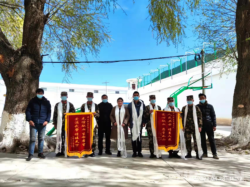 圖為洛隆縣人民醫院為光榮獻血的洛隆縣武警支隊官兵們送上錦旗