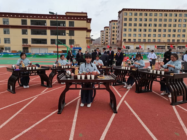 茶藝展示現場,茶具一字排開,旅游專業的同學們進行沖泡表演,把傳統文化轉化為藝術美感,在增進對茶文化了解、學會技能的同時也陶冶了情操。