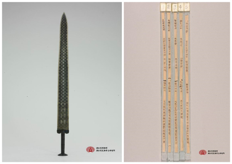 圖為湖北省博物館的兩件鎮館之寶:左為歷經2500余年依然寒光閃閃、毫無銹蝕的“天下第一劍”——越王勾踐劍,右為云夢睡虎地秦簡 圖片來源:湖北省博物館網站